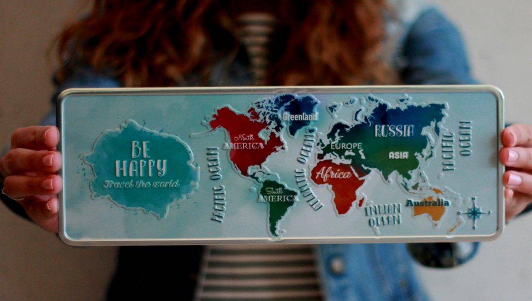In this wonderful plate, we find the world map with a blue background that contrasts with the different colors given to the continents. With a great allusion to the happiness of travelling around the world, with the quote : “BE HAPPY – TRAVEL THE WORLD”.