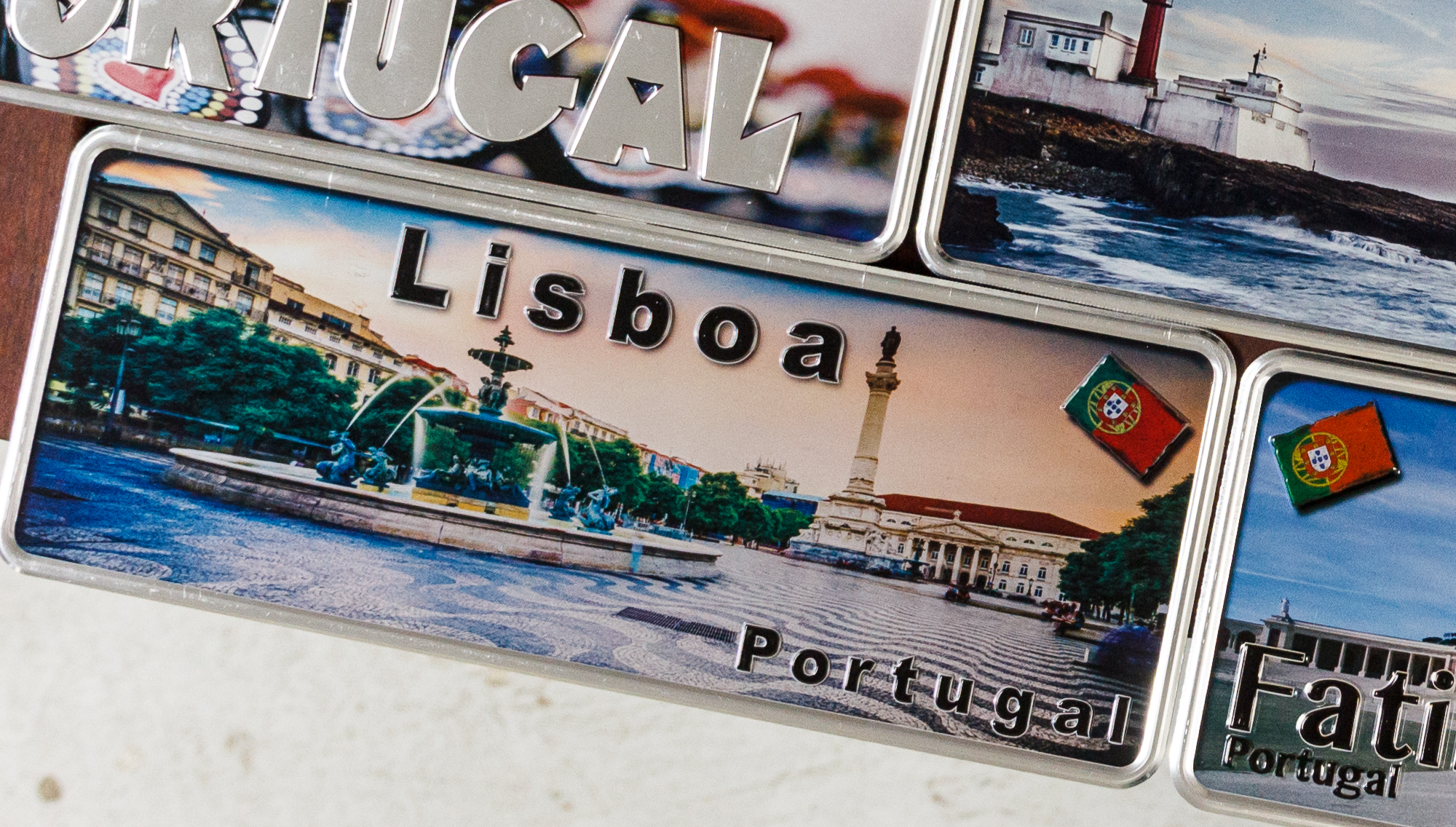 Plate with the illustration of the unmistakable Rossio Square . The name of Portugal and its capital, Lisboa, are represented in relief and black. In this plate, we can also see the National flag of Portugal, in high relief.