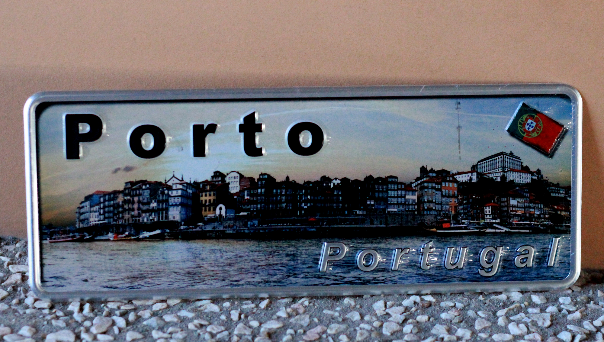 The city of Porto in panoramic illustration, with a view to the emblematic ‘Ribeira‘. The name of the city – Porto, stands out in high relief and in black color. ‘Portugal’, also in relief, is presented in natural color of aluminium. The Plate also contains the National Flag in relief.